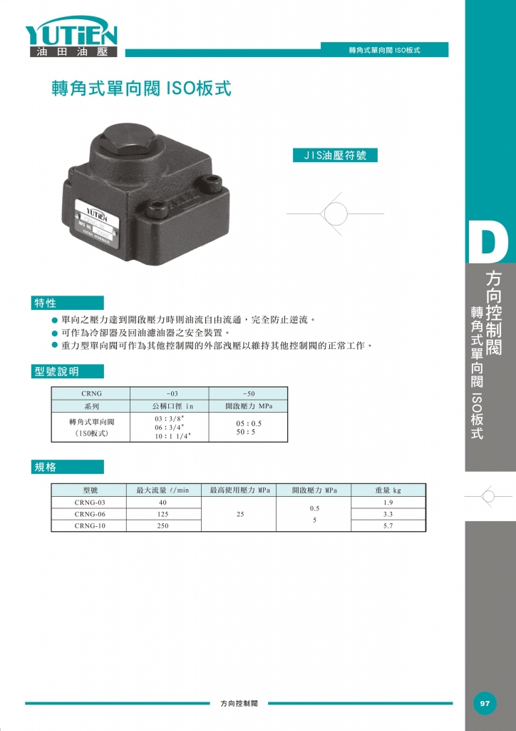 YUTIEN转角式单向阀部分常规型号参考:CRNG-03-05 , CRNG-03-50 , CRNG-06-05 , CRNG-06-50 , CRNG-10-05 , CRNG-10-50